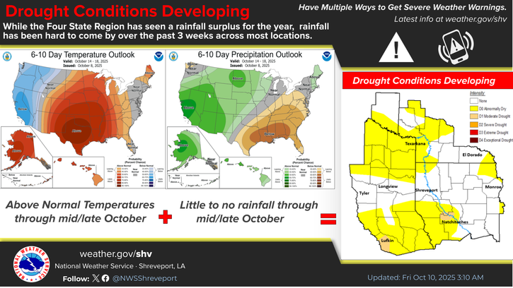 EL DORADO – South Arkansas is set to endure escalating drought conditions as above-normal temperatures combine with below-normal rainfall through at least the next 10-plus days, impacting the entire Four-State Region of Arkansas, Louisiana, Texas, and Mississippi, per the National Weather Service in Shreveport.