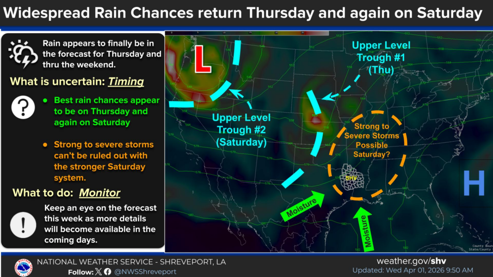 EL DORADO, Ark. — Rain chances are expected to return to South Arkansas beginning Thursday, with unsettled weather continuing into the upcoming Easter weekend, according to the National Weather Service in Shreveport.