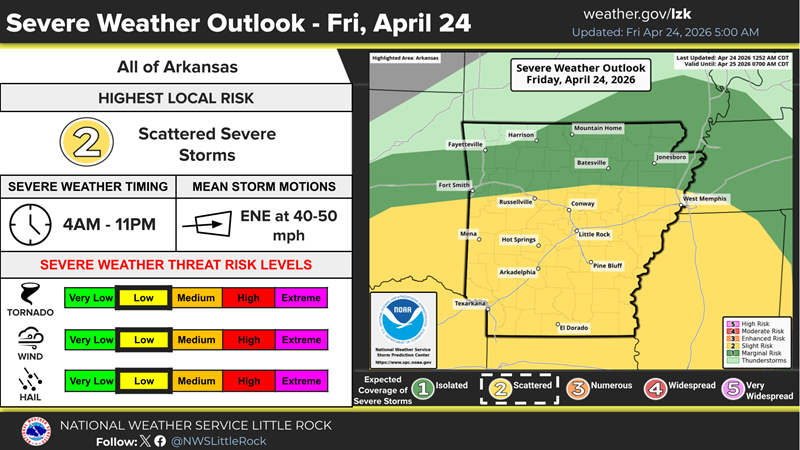 In addition to Friday’s threat, forecasters say the overall weather pattern will remain unsettled into the weekend and early next week, increasing the chances for multiple rounds of storms across Arkansas.