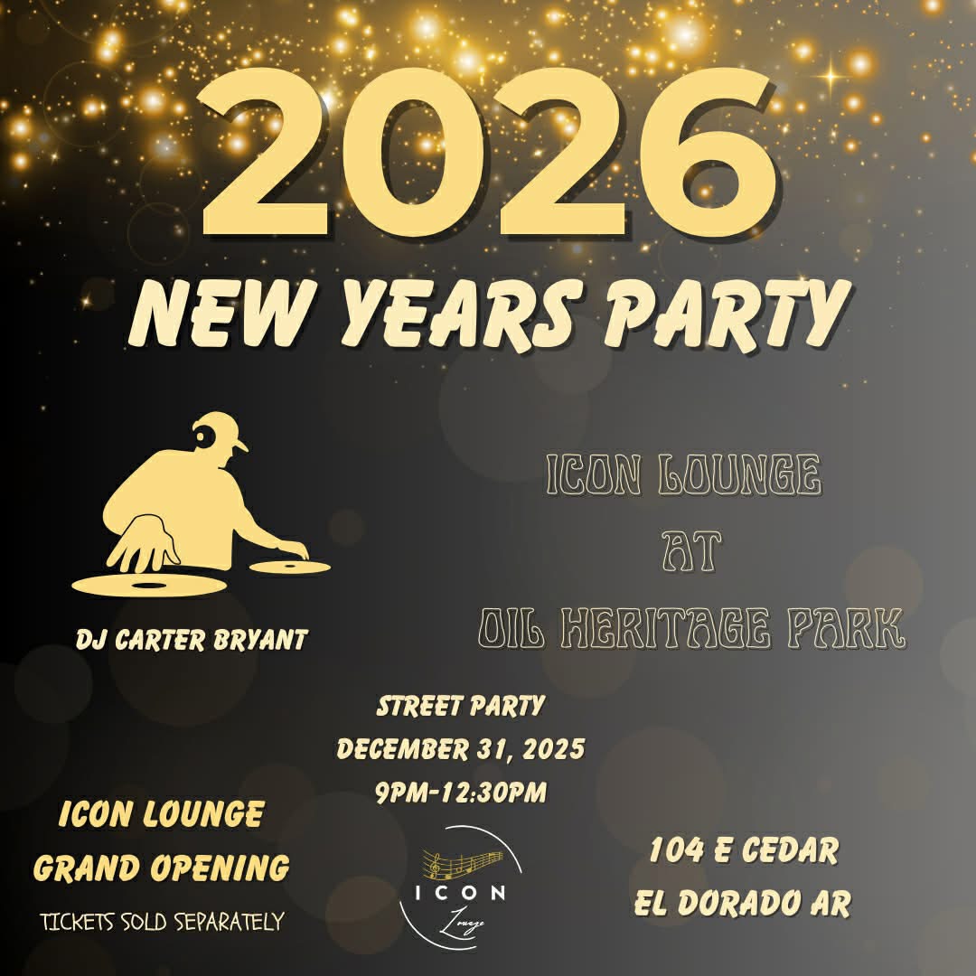 El Dorado, AR — The El Dorado community is invited to celebrate the arrival of the New Year at a free New Year’s Eve Street Party on Wednesday, December 31, 2025, in downtown El Dorado. The celebration will take place at Oil Heritage Park beginning at 9:00 p.m. and will feature music by DJ Carter, food trucks, and a community countdown leading up to a special ball lighting at midnight. This year’s event continues a beloved New Year’s Eve tradition that has brought the community together for the past two years. While the location is new, the welcoming and festive atmosphere remains the same. The free street party is hosted with the support of Icon Lounge. The downtown entertainment district will be open on New Year’s Eve from noon until 1:00 a.m. Tickets for Icon Lounge events are sold separately. Food trucks on site will include Snacks Abuelita, McGraw’s BBQ, and Slap Ya Mama. Security will be provided, with support from the El Dorado Police Department and the Union County Sheriff’s Office. Special thanks are extended to Evers Electric and Equipment Share for their work to ensure the New Year’s Eve ball lighting is ready for the midnight celebration, as well as to Erick Meadows and Main Street El Dorado for their assistance in making the event possible. Community members are encouraged to gather downtown, celebrate safely, and welcome 2026 together