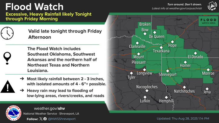 EL DORADO — The National Weather Service in Shreveport has issued a Flood Watch that includes El Dorado and much of South Arkansas through Friday afternoon as rounds of heavy rain move across the region late tonight into Friday morning.