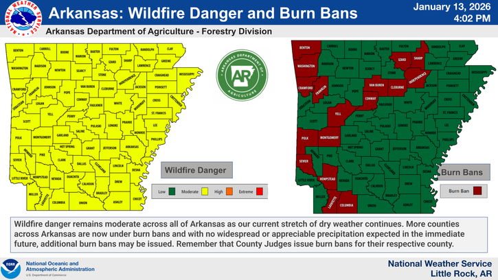 Updated wildfire danger information and burn ban status are coordinated with the National Weather Service, which continues to monitor weather patterns that could influence fire behavior across South Arkansas.