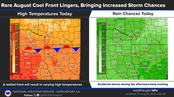 EL DORADO – A rare cool front stalled across the Four State Region is bringing relief from extreme heat along with elevated chances for rain, according to the National Weather Service in Shreveport.