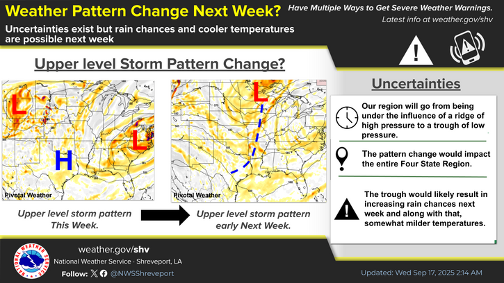 EL DORADO – A shift in the weather pattern could bring rain and a break from the summer heat across South Arkansas next week, according to the National Weather Service in Shreveport.