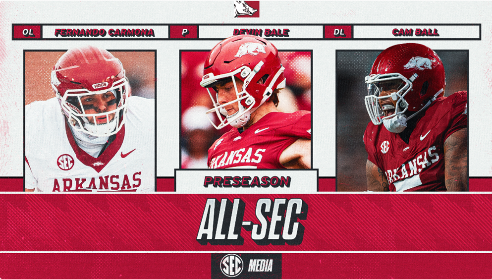 FAYETTEVILLE – Arkansas redshirt-senior offensive lineman Fernando Carmona (Second Team), redshirt-senior punter Devin Bale (Third Team) and redshirt-senior defensive lineman Cam Ball (Third Team) all earned Preseason All-Southeastern Conference recognition from media covering SEC Football Media Days, the league announced Friday afternoon.