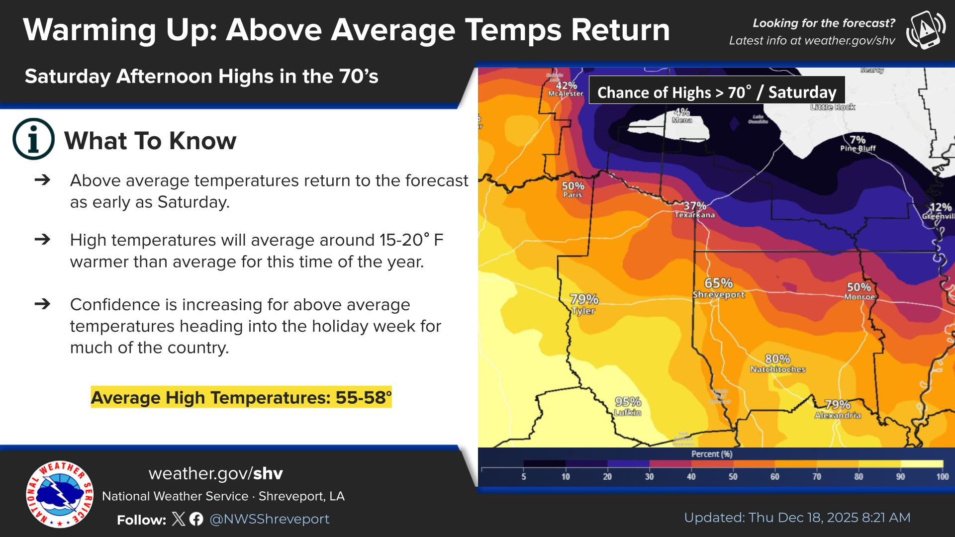 The National Weather Service notes that average high temperatures for South Arkansas typically range from the mid-50s to upper 50s in mid-December, making this weekend’s forecast significantly warmer than normal.